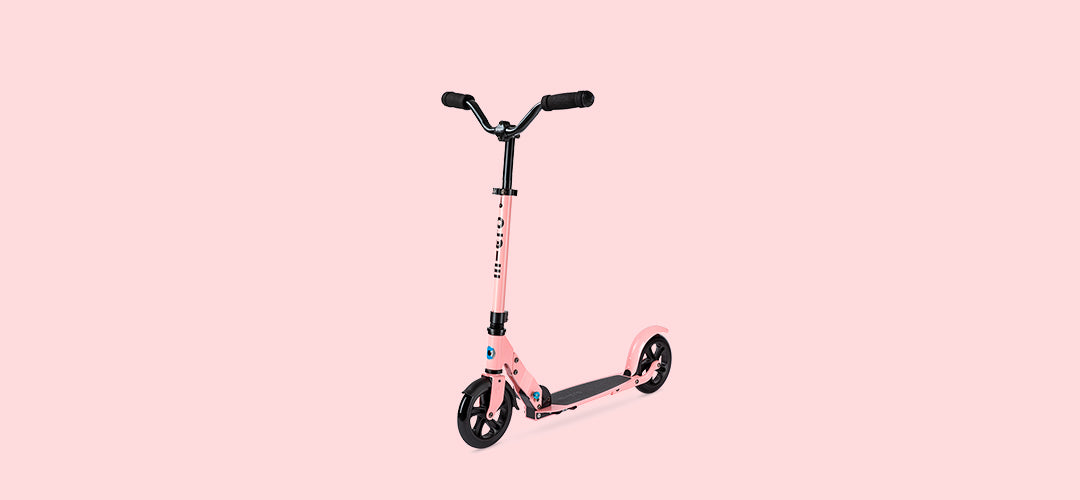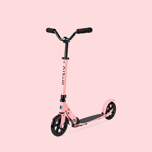 Las grandes ruedas con un diámetro de 180 mm garantizan una conducción suave, incluso en superficies rugosas. Además, este moderno scooter de aluminio con su manubrio chopper dispone de tapabarros adelante y detrás para protegerte de forma confiable de la suciedad y las salpicaduras de agua. El Micro Speed Deluxe se puede plegar de forma compacta para transportarlo o guardarlo.